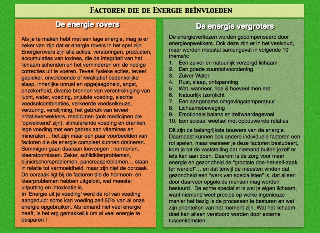 In de Natuur&Gezondheid-module E / Energie van Natur-El vind je in ieder geval veel inspiratie. Het is een combo van digitale boeken over de energie-vergroters en de energie-rovers en alles wat een invloed heeft op de energie-beleving. Vind hierin de gepaste strategie voor meer energie ! Deze digitale Module kost 30 euro. Aanvragen