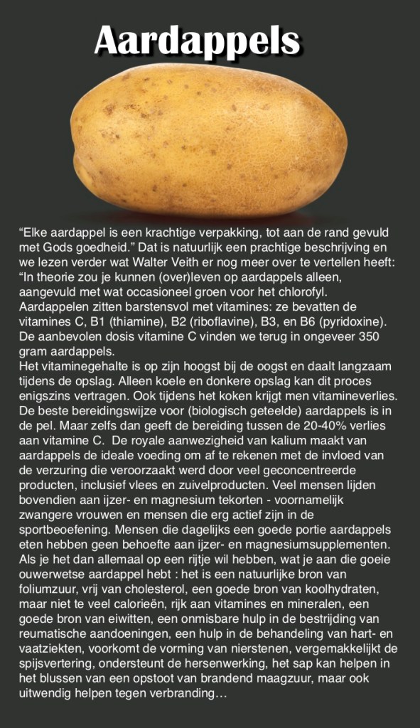 Ik gebruik dus het voorbeeld van het aardappeldieet toch maar… omdat je het van een aardappel wellicht niet zou verwachten dat het mogelijk is om daarop te over leven… meer nog, beter te worden. Als het met aardappels mogelijk is, moet het met andere natuurlijke voedingsmiddelen ook mogelijk zijn, vooral omdat de meeste andere groenten en fruit nog veel meer te bieden hebben !