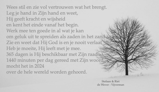 We staan nu voor het nieuwe jaar en mensen zullen elkaar allerlei goede wensen aanbieden. Maar dat u en ik samen standvastig blijven in Gods woord en de kracht mogen ontvangen om “de goede strijd des geloofs” verder te strijden, lijkt me het beste om voor te bidden en te ijveren. Mocht het uw dagelijkse ervaring zijn in 2024 – overwinning na overwinning.